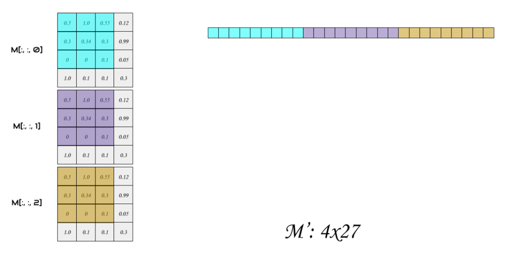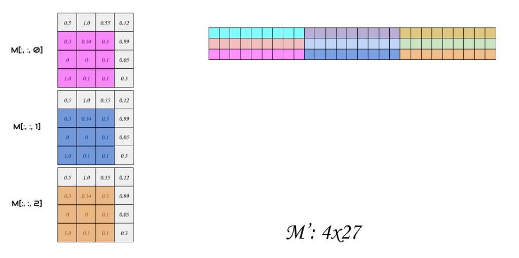 Let’s see if we can straight optimize this code using im2col. One thing we can do is, when we generate the column matrix M’, is to apply im2col to every channel, and concatenate all columns together as a single column into our new matrix as in the images, below thus the final output shape of M’ is (Cx*Cy, m’*n’*d) where Cx and Cy are the convolution output shape calculated using standard output formula from Part I, and m’, n’, d are the dimensions of the filter